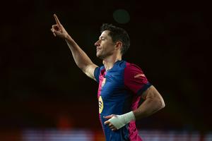 (250127) -- BARCELONA, 27 enero, 2025 (Xinhua) -- Imagen del 26 de enero de 2025 de Robert Lewandowski, de Barcelona, festejando su anotación durante el partido de LaLiga, entre FC Barcelona y Valencia CF, en Barcelona, España. (Xinhua/Joan Gosa) (rtg) (ah) (vf)
