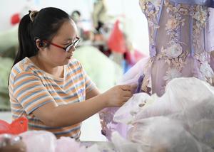 (250421) -- LU'AN, 21 abril, 2025 (Xinhua) -- Imagen del 15 de abril de 2025 de una empleada confeccionando un vestido de novia en una empresa de vestidos de novia, en el poblado de Dingji, en el distrito de Yu'an de la ciudad de Lu'an, en la provincia de Anhui, en el este de China. El poblado de Dingji, en la ciudad de Lu'an es una famosa base de producción y exportación de vestidos de novias en China. (Xinhua/Cai Xiangxin) (rtg) (ah) (vf)
