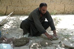 (250826) -- KABUL, 26 agosto, 2025 (Xinhua) -- Imagen del 25 de agosto de 2025 de un aldeano utilizando recipientes kangina terminadas como moldes para dar forma a cuencos nuevos, en las afueras del norte de Kabul, capital de Afganistán. El kangina, una antigua tinaja de barro para conservar las uvas, se ha utilizado ampliamente en las zonas rurales al norte de Kabul. Este recipiente afgano centenario permite que las uvas cosechadas en el calor del verano se mantengan frescas hasta la primavera siguiente. (Xinhua/Li Ang) (oa) (ah)