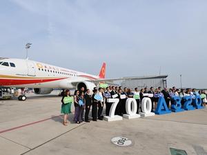 (240711) -- BEIJING, July 11, 2024 (Xinhua) -- Guests attending the delivery ceremony of the 700th A320 family aircraft assembled by Airbus Tianjin to Chengdu Airlines pose for a group photo in front of the A320neo aircraft in Tianjin, north China, July 8, 2024. (Xinhua/Li Ran)