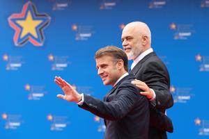 (250516) -- TIRANA, 16 mayo, 2025 (Xinhua) -- El presidente francés, Emmanuel Macron (frente), asiste a la sexta Cumbre de la Comunidad Política Europea (CPE), en Tirana, Albania, el 16 de mayo de 2025. La sexta Cumbre de la CPE se llevó a cabo el viernes en Tirana, capital de Albania, con la asistencia de aproximadamente 50 líderes nacionales y regionales, así como jefes de la Unión Europea y de instituciones internacionales que asisten para abordar los desafíos económicos y de seguridad compartidos. (Xinhua/Zhao Dingzhe) (jg) (da) (ce)