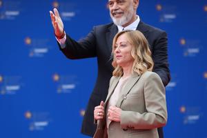 (250516) -- TIRANA, 16 mayo, 2025 (Xinhua) -- La primera ministra italiana, Giorgia Meloni (frente), asiste a la sexta Cumbre de la Comunidad Política Europea (CPE), en Tirana, Albania, el 16 de mayo de 2025. La sexta Cumbre de la CPE se llevó a cabo el viernes en Tirana, capital de Albania, con la asistencia de aproximadamente 50 líderes nacionales y regionales, así como jefes de la Unión Europea y de instituciones internacionales que asisten para abordar los desafíos económicos y de seguridad compartidos. (Xinhua/Zhao Dingzhe) (jg) (da) (ce)