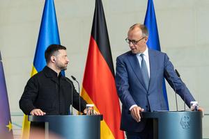 (260414) -- BERLIN, 14 abril, 2026 (Xinhua) -- El canciller alemán, Friedrich Merz (d), y el presidente ucraniano, Volodymyr Zelensky, asisten a una conferencia de prensa en la Cancillería alemana, en Berlín, Alemania, el 14 de abril de 2026. Alemania y Ucrania anunciaron el martes elevar sus relaciones bilaterales a una "asociación estratégica", y los líderes de ambos países se comprometieron a intensificar la cooperación en materia de defensa y economía. (Xinhua/Zhang Haofu) (oa) (ah) (vf)