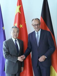 (250704) -- BERLIN, 4 julio, 2025 (Xinhua) -- El ministro de Relaciones Exteriores chino, Wang Yi, también miembro del Buró Político del Comité Central del Partido Comunista de China, se reúne con el canciller de Alemania, Friedrich Merz, en Berlín, Alemania, el 4 de julio de 2025. (Xinhua/Du Zheyu) (jg) (da) (ce)