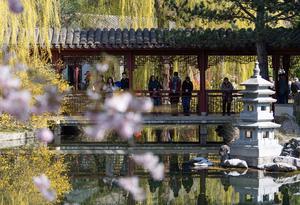 (260412) -- BERLIN, 12 abril, 2026 (Xinhua) -- Imagen del 11 de abril de 2026 de personas visitando el Jardín Chino durante el Festival de Flores de Cerezo en los Jardines del Mundo, en Berlín, Alemania. Se espera que alrededor de 25.000 visitantes participen en el XVIII Festival de Flores de Cerezo. (Xinhua/Zhang Haofu) (rtg) (da)