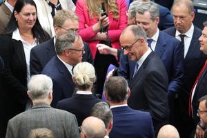 (250507) — BERLÍN, 7 mayo, 2025 (Xinhua) — Imagen del 6 de mayo de 2025 de Friedrich Merz (c-d), líder de la conservadora Unión Cristianodemócrata de Alemania, siendo recibido tras ser elegido canciller en el edificio del Reichstag, en Berlín, Alemania. Friedrich Merz juró como canciller el martes durante una sesión del Bundestag, la cámara baja del Parlamento del país. Merz obtuvo 325 votos del Bundestag, superando la mayoría necesaria de 316 escaños. (Xinhua/Du Zheyu) (jg) (da) (vf)