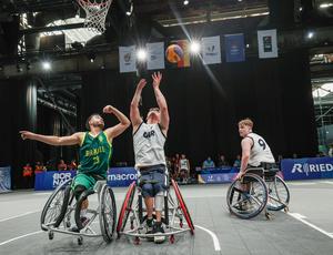 (250720) -- BOCHUM, 20 julio, 2025 (Xinhua) -- Imagen del 19 de julio de 2025 de Joao Matheus Duarte Padilha (i), de Brasil, y Alexander Huw Marshall-Wilson, de Reino Unido, disputando por un rebote durante el partido de baloncesto en silla de ruedas 3x3 masculino entre Reino Unido y Brasil, en los Juegos Mundiales Universitarios de la FISU de Rin-Ruhr 2025, en Bochum, Alemania. (Xinhua/Zhang Fan) (rtg) (da)