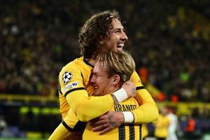 (251211) -- DORTMUND, 11 diciembre, 2025 (Xinhua) -- Imagen del 10 de diciembre de 2025 de Julian Brandt (frente), de Borussia Dortmund, festejando una anotación junto a su compañero Fabio Silva durante el partido de fútbol de la Liga de Campeones de la UEFA, entre Borussia Dortmund y Bodo/Glimt, en Dortmund, Alemania. (Xinhua/Joachim Bywaletz) (rtg) (ra) (vf)