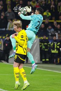 (250220) -- DORTMUND, 20 febrero, 2025 (Xinhua) -- Imagen del 19 de febrero de 2025 del guardameta Rui Silva (d), de Sporting CP, atajando el balón durante el partido de fútbol de vuelta de play-off de la fase eliminatoria de la Liga de Campeones de la UEFA entre Borussia Dortmund y Sporting CP, en Dortmund, Alemania. (Xinhua/Joachim Bywaletz) (da) (ra) (ce)