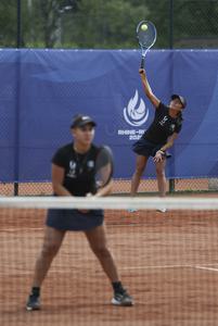 (250719) -- ESSEN, 19 julio, 2025 (Xinhua) -- Aiko Coballasy Lardizábal/Fátima Daniela Núñez Chagoya (d) compiten durante el partido de octavos de final de dobles femeninos de tenis entre Li Zongyu/Yao Xinxin, de China, y Aiko Coballasy Lardizábal/Fátima Daniela Núñez Chagoya, de México, en los Juegos Mundiales Universitarios de la FISU de Rin-Ruhr 2025, en Essen, Alemania, el 19 de julio de 2025. (Xinhua/Hu Xingyu) (oa) (da)
