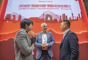(250402) — HANNOVER, 2 abril, 2025 (Xinhua) — Imagen del 1 de abril de 2025 de personas conversando en el estand de exposición de «Invest in China» en la Hannover Messe 2025, en Hannover, Alemania. Celebrada bajo el lema «energizando una industria sostenible», el evento de cinco días ha atraído a más de 3.800 expositores de alrededor de 60 países y regiones. Las empresas chinas representan una parte importante de los participantes, con alrededor de 1.000 expositores, lo que convierte a China en el segundo grupo de expositores más grande después del país anfitrión Alemania. (Xinhua/Zhang Fan) (ah) (ra) (vf)