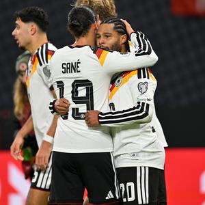 (251118) -- LEIPZIG, 18 noviembre, 2025 (Xinhua) -- Imagen del 17 de noviembre de 2025 de Serge Gnabry (d-frente), de Alemania, festejando su anotación junto a su compañero Leroy Sané durante el partido de las Clasificatorias Europeas para la Copa Mundial 2026 entre Alemania y Eslovaquia, en Leipzig, Alemania. (Xinhua/Ulrich Hufnagel) (oa) (ah) (vf)