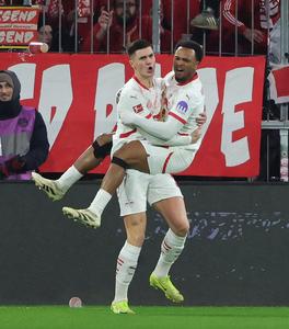 (241221) — MUNICH, 21 diciembre, 2024 (Xinhua) — Imagen del 20 de diciembre de 2024 de Lois Openda (d) y Benjamin Sesko, de RB Leipzig, festejando una anotación durante el partido de fútbol de la primera división alemana de la Bundesliga entre Bayern Munich y RB Leipzig, en Múnich, Alemania. (Xinhua/Philippe Ruiz) (oa) (da)