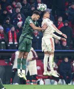(250219) -- MUNICH, 19 febrero, 2025 (Xinhua) -- Imagen del 18 de febrero de 2025 de Michael Olise (d), de Bayern Munich, disputando el balón con Auston Trusty, de Celtic FC, durante el partido de fútbol de vuelta de play-off de la fase eliminatoria de la Liga de Campeones de la UEFA entre Bayern Munich y Celtic FC, en Múnich, Alemania. (Xinhua/Philippe Ruiz) (ah) (ra) (vf)