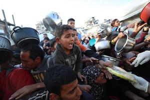 (250323) -- GAZA, 23 marzo, 2025 (Xinhua) -- Imagen del 22 de marzo de 2025 de palestinos esperando para recibir comida gratuita de un centro de distribución de alimentos, en Beit Lahia, en el norte de la Franja de Gaza. (Xinhua/Mahmoud Zaki) (oa) (ah)