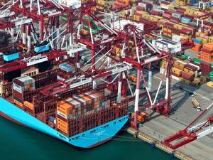 (250819) -- QINGDAO, Aug. 19, 2025 (Xinhua) -- An aerial drone photo taken on Aug. 19, 2025 shows a cargo ship at Qingdao Port in Qingdao, east China's Shandong Province. As of the end of July, Qingdao Port has added 22 new outbound trade routes this year, bringing its total to 233 and connecting to over 700 ports in more than 180 countries and regions. (Xinhua/Li Ziheng)