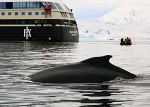 (251217) -- ANTARTIDA, 17 diciembre, 2025 (Xinhua) -- Imagen del 13 de diciembre de 2025 de una ballena jorobada vista con un crucero al fondo, en Antártida. (Xinhua/Yang Shu) (ah) (ra) (vf)