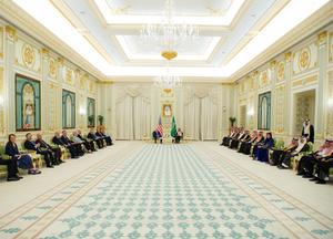(250513) -- RIAD, 13 mayo, 2025 (Xinhua) -- El príncipe heredero y primer ministro saudí, Mohammed bin Salman Al Saud (c-d), se reúne con el visitante presidente estadounidense, Donald Trump (c-i), en Riad, Arabia Saudí, el 13 de mayo de 2025. Trump aseguró el martes en Riad un compromiso de inversión de 600.000 millones de dólares con Arabia Saudí y prometió suspender las sanciones contra Siria. (Xinhua/Saudi Press Agency) (vf) (ce)