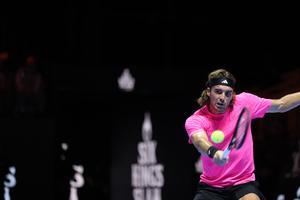 (251016) -- RIAD, 16 octubre, 2025 (Xinhua) -- Imagen del 15 de octubre de 2025 de Stefanos Tsitsipas, de Grecia, devolviendo la pelota durante el partido de cuartos de final ante Jannik Sinner, de Italia, en el torneo de tenis Six Kings Slam, en Riad, Arabia Saudita. (Xinhua/Wang Haizhou) (da) (ra) (ce)