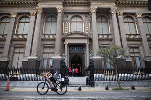 (260107) -- BUENOS AIRES, 7 enero, 2026 (Xinhua) -- Un hombre circula en una bicicleta frente a la sede del Banco Central de la República Argentina (BCRA), en la ciudad de Buenos Aires, capital de Argentina, el 7 de enero de 2026. El BCRA anunció el miércoles que concertó con seis bancos internacionales una nueva operación financiera tipo "Repo", que le permite obtener financiamiento por 3.000 millones de dólares, a un plazo de poco más de un año. (Xinhua/Martín Zabala) (mz) (ah) (vf)