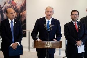 (260406) -- BUENOS AIRES, 6 abril, 2026 (Xinhua) -- El presidente chileno, José Antonio Kast (c), habla junto al ministro de Relaciones Exteriores chileno, Francisco Pérez Mackenna (d), y al embajador de Chile en Argentina, Gonzalo Uriarte Herrera (i), durante una conferencia de prensa en la sede de la Embajada de Chile en Argentina, en la ciudad de Buenos Aires, capital de Argentina, el 6 de abril de 2026. El presidente de Argentina, Javier Milei, recibió el lunes en la Casa de Gobierno a su homólogo de Chile, José Antonio Kast, con objeto de establecer las prioridades de la relación bilateral. (Xinhua/Martín Zabala) (mz) (rtg) (ah) (vf)