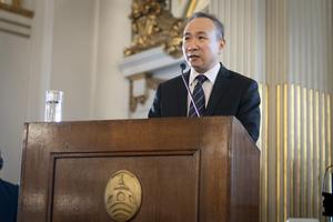 (250805) -- BUENOS AIRES, 5 agosto, 2025 (Xinhua) -- Imagen del 4 de agosto de 2025 del embajador de China en Argentina, Wang Wei, hablando durante el acto por el 80° aniversario de la Victoria de la Guerra de Resistencia del Pueblo Chino contra la Agresión Japonesa y la Guerra Mundial Antifascista, en el Salón Dorado de la Legislatura, en la ciudad de Buenos Aires, capital de Argentina. Una exhibición fotográfica conmemorativa del 80° aniversario de la Victoria de la Guerra de Resistencia del Pueblo Chino contra la Agresión Japonesa y la Guerra Mundial Antifascista fue inaugurada el lunes en la Legislatura de la Ciudad de Buenos Aires, capital de Argentina, como un homenaje a uno de los capítulos más significativos del siglo XX. (Xinhua/Martín Zabala) (mz) (rtg) (ah) (ce)