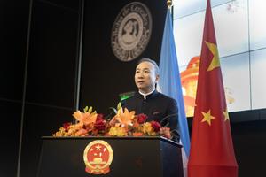 (250917) -- BUENOS AIRES, 17 septiembre, 2025 (Xinhua) -- Imagen del 16 de septiembre de 2025 del embajador de China en Argentina, Wang Wei, hablando durante el acto en conmemoración del 76º aniversario de la fundación de la República Popular China, en la ciudad de Buenos Aires, capital de Argentina. La Embajada de China en Argentina celebró el martes en Buenos Aires el 76º aniversario de la fundación de la República Popular China, con la presencia de autoridades nacionales, provinciales y locales, de las Fuerzas Armadas y de Seguridad, y también del cuerpo diplomático acreditado ante el país sudamericano, junto con dirigentes de todo el arco político, además de académicos y representantes del ámbito empresarial y educativo. (Xinhua/Martín Zabala) (mz) (ah) (ce)