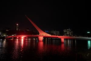 (250129) -- BUENOS AIRES, 29 enero, 2025 (Xinhua) -- Imagen del 28 de enero de 2025 del Puente de la Mujer iluminado de rojo durante las celebraciones del Año Nuevo chino, en la ciudad de Buenos Aires, capital de Argentina. Buenos Aires, la capital de Argentina, se tiñó de rojo el martes por la noche para celebrar la llegada del Año Nuevo chino, con coloridos espectáculos y luces en el Gran Barrio Chino, en monumentos y edificios emblemáticos a lo largo de diferentes distritos porteños. (Xinhua/Martín Zabala) (mz) (ah) (ra) (vf)
