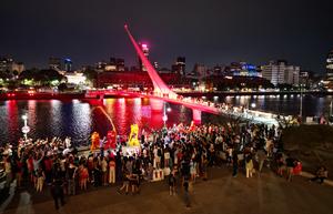 (250129) -- BUENOS AIRES, 29 enero, 2025 (Xinhua) -- Imagen tomada con un dron el 28 de enero de 2025 de artistas marciales de la escuela Lung Chuan interpretando la danza del león frente al Puente de la Mujer, iluminado de rojo, durante las celebraciones del Año Nuevo chino, en la ciudad de Buenos Aires, capital de Argentina. Buenos Aires, la capital de Argentina, se tiñó de rojo el martes por la noche para celebrar la llegada del Año Nuevo chino, con coloridos espectáculos y luces en el Gran Barrio Chino, en monumentos y edificios emblemáticos a lo largo de diferentes distritos porteños. (Xinhua/Ezequiel Putruele) (mz) (ah) (ra) (vf)