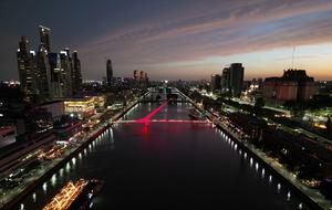 (250129) -- BUENOS AIRES, 29 enero, 2025 (Xinhua) -- Imagen tomada con un dron el 28 de enero de 2025 del Puente de la Mujer iluminado de rojo durante las celebraciones del Año Nuevo chino, en la ciudad de Buenos Aires, capital de Argentina. Buenos Aires, la capital de Argentina, se tiñó de rojo el martes por la noche para celebrar la llegada del Año Nuevo chino, con coloridos espectáculos y luces en el Gran Barrio Chino, en monumentos y edificios emblemáticos a lo largo de diferentes distritos porteños. (Xinhua/Ezequiel Putruele) (mz) (ah) (ra) (vf)