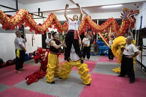 (250124) -- BUENOS AIRES, 24 enero, 2025 (Xinhua) -- Imagen del 22 de enero de 2025 de integrantes de la escuela Lung Chuan ensayando la danza del León previo a su participación en las festividades del próximo Año Nuevo Lunar chino, en la ciudad de Buenos Aires, capital de Argentina. Entusiastas argentinos de la cultura china ensayan con esmero y pasión las coloridas danzas del Dragón y del León, uno de los espectáculos chinos más importantes, para recibir el Año Nuevo Lunar chino o Fiesta de la Primavera. (Xinhua/Martín Zabala) (mz) (oa) (ra) (vf)