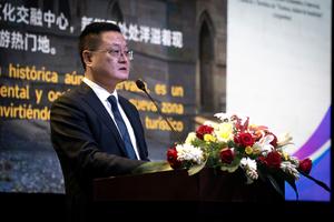 (250410) -- BUENOS AIRES, 10 abril, 2025 (Xinhua) -- Imagen del 9 de abril de 2025 del director del Buró de Cultura y Turismo de Fuzhou, Chen Yu, hablando durante la denominada "Conferencia de Promoción Económica, Comercial, Cultural y Turística de Fuzhou, ciudad de bendición", en la ciudad de Buenos Aires, capital de Argentina. La ciudad china de Fuzhou promociona en la ciudad de Buenos Aires, capital de Argentina, su riqueza económica, comercial, cultural y turística, a fin de trazar un camino de acción común con distintas alcaldías del país sudamericano, las que se mostraron interesadas en profundizar los intercambios. (Xinhua/Martín Zabala) (mz) (ah) (ra) (ce)