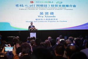 (250410) -- BUENOS AIRES, 10 abril, 2025 (Xinhua) -- Imagen del 9 de abril de 2025 del alcalde del Gobierno Popular Municipal de Fuzhou, Wu Xiande, hablando durante la denominada "Conferencia de Promoción Económica, Comercial, Cultural y Turística de Fuzhou, ciudad de bendición", en la ciudad de Buenos Aires, capital de Argentina. La ciudad china de Fuzhou promociona en la ciudad de Buenos Aires, capital de Argentina, su riqueza económica, comercial, cultural y turística, a fin de trazar un camino de acción común con distintas alcaldías del país sudamericano, las que se mostraron interesadas en profundizar los intercambios. (Xinhua/Martín Zabala) (mz) (ah) (ra) (ce)