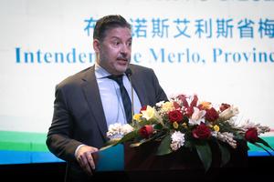 (250410) -- BUENOS AIRES, 10 abril, 2025 (Xinhua) -- Imagen del 9 de abril de 2025 del intendente (alcalde) de la ciudad bonaerense de Merlo, Gustavo Menéndez, hablando durante la denominada "Conferencia de Promoción Económica, Comercial, Cultural y Turística de Fuzhou, ciudad de bendición", en la ciudad de Buenos Aires, capital de Argentina. La ciudad china de Fuzhou promociona en la ciudad de Buenos Aires, capital de Argentina, su riqueza económica, comercial, cultural y turística, a fin de trazar un camino de acción común con distintas alcaldías del país sudamericano, las que se mostraron interesadas en profundizar los intercambios. (Xinhua/Martín Zabala) (mz) (ah) (ra) (ce)