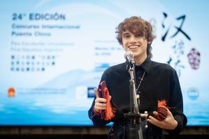 (250521) -- BUENOS AIRES, 21 mayo, 2025 (Xinhua) -- Imagen del 20 de mayo de 2025 de Luciano García Zárate, concursante del Instituto Confucio de la Universidad Nacional de La Plata, participando en la 24ª edición del Concurso Internacional Puente Chino en el auditorio de la Facultad de Ciencias Económicas de la Universidad de Buenos Aires, en la ciudad de Buenos Aires, capital de Argentina. Argentina celebró el martes la final nacional de la 24ª edición del Concurso Internacional Puente Chino, en la que el joven Luciano García Zárate, del Instituto Confucio de la Universidad Nacional de La Plata, obtuvo el primer puesto, ganándose así la oportunidad de representar al país en la competencia mundial que se realizará próximamente en China. (Xinhua/Martín Zabala) (mz) (ah) (ra) (vf)