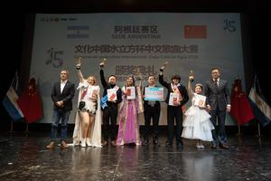 (250602) -- BUENOS AIRES, 2 junio, 2025 (Xinhua) -- Imagen del 1 de junio de 2025 del presidente de la Fundación de Cultura y Educación China en Argentina, Liu Fangyong (4-d), posando junto a concursantes ganadores del premio de oro durante la edición 2025 del concurso de canto internacional en idioma chino "Copa Cubo de Agua", en la ciudad de Buenos Aires, Argentina. Argentina acogió el domingo la edición 2025 del concurso de canto internacional en idioma chino "Copa Cubo de Agua", un evento que sirvió como puente de amistad y cultura para acercar a los pueblos de los dos países. (Xinhua/Martín Zabala) (mz) (rtg) (oa) (vf)