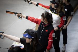 (250409) -- BUENOS AIRES, 9 abril, 2025 (Xinhua) -- Imagen del 8 de abril de 2025 de la atleta, Qian Wei (c), de China, compitiendo durante la final de la categoría pistola de aire comprimido 10 metros femenino en el Mundial de Tiro Buenos Aires 2025, en el polígono del Tiro Federal Argentino, en la ciudad de Buenos Aires, capital de Argentina. El presidente de la Federación Internacional de Tiro Deportivo, el italiano Luciano Rossi, elogió el martes las actuaciones de los atletas de China e India en el Mundial de Tiro Buenos Aires 2025. (Xinhua/Martín Zabala) (mz) (ah) (ra) (ce)
