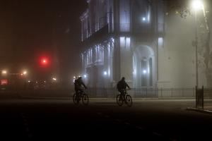 (250709) -- BUENOS AIRES, 9 julio, 2025 (Xinhua) -- Imagen del 8 de julio de 2025 de dos hombres circulando en bicicleta bajo una capa de niebla frente al Cabildo, en la ciudad de Buenos Aires, capital de Argentina. El Area central de Argentina quedó el martes bajo alerta a consecuencia de una espesa capa de niebla, fenómeno climático que ha provocado complicaciones en vuelos comerciales, el cierre de aeropuertos y accidentes de tránsito, además de trastornos a la circulación de trenes y autobuses, según el reporte de las autoridades locales. (Xinhua/Martín Zabala) (mz) (jg) (da) (vf)