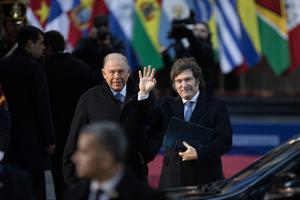 (250703) -- BUENOS AIRES, 3 julio, 2025 (Xinhua) -- El presidente argentino, Javier Milei (d), saluda junto al ministro de Relaciones Exteriores, Comercio Internacional y Culto argentino, Gerardo Werthein (i), durante la LXVI Cumbre de Presidentes del Mercosur y Estados Asociados, en el Palacio San Martín, sede de la cancillería argentina, en la ciudad de Buenos Aires, capital de Argentina, el 3 de julio de 2025. Los presidentes de los países que integran el Mercado Común del Sur (Mercosur) iniciaron el jueves en la ciudad argentina de Buenos Aires una cumbre en la que prevén revisar el estado de la integración regional, así como posibles acuerdos con otras regiones y países del mundo. (Xinhua/Martín Zabala) (mz) (jg) (ah) (ce)