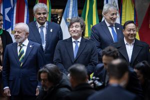 (250703) -- BUENOS AIRES, 3 julio, 2025 (Xinhua) -- (De izq. a der.) El presidente brasileño, Luiz Inácio Lula da Silva, el presidente panameño, José Raúl Mulino, el presidente argentino, Javier Milei, el ministro de Relaciones Exteriores chileno, Alberto van Klaveren, y el presidente boliviano, Luis Arce, reaccionan en la toma de la foto de familia durante la LXVI Cumbre de Presidentes del Mercosur y Estados Asociados, en el Palacio San Martín, sede de la cancillería argentina, en la ciudad de Buenos Aires, capital de Argentina, el 3 de julio de 2025. Los presidentes de los países que integran el Mercado Común del Sur (Mercosur) iniciaron el jueves en la ciudad argentina de Buenos Aires una cumbre en la que prevén revisar el estado de la integración regional, así como posibles acuerdos con otras regiones y países del mundo. (Xinhua/Martín Zabala) (mz) (jg) (ah) (ce)
