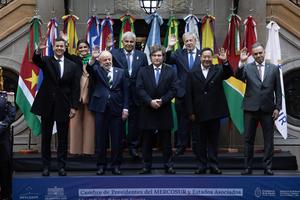 (250703) -- BUENOS AIRES, 3 julio, 2025 (Xinhua) -- El presidente argentino, Javier Milei (c), encabeza la toma de la foto de familia junto a jefes de Estado y representantes de los países miembros y asociados, durante la LXVI Cumbre de Presidentes del Mercosur y Estados Asociados, en el Palacio San Martín, sede de la cancillería argentina, en la ciudad de Buenos Aires, capital de Argentina, el 3 de julio de 2025. Los presidentes de los países que integran el Mercado Común del Sur (Mercosur) iniciaron el jueves en la ciudad argentina de Buenos Aires una cumbre en la que prevén revisar el estado de la integración regional, así como posibles acuerdos con otras regiones y países del mundo. (Xinhua/Martín Zabala) (mz) (jg) (ah) (ce)