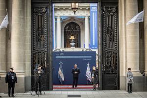 (250702) -- BUENOS AIRES, 2 julio, 2025 (Xinhua) -- El ministro de Relaciones Exteriores argentino, Gerardo Werthein (c), espera la llegada de sus homólogos de los países miembros durante la LXVI Cumbre de Presidentes del Mercosur y Estados Asociados, en el Palacio San Martín, sede ceremonial de la cancillería argentina, en la ciudad de Buenos Aires, capital de Argentina, el 2 de julio de 2025. Una nueva Cumbre del Mercado Común del Sur (Mercosur) inició el miércoles en Buenos Aires, la capital argentina, con reuniones encabezadas por ministros de Relaciones Exteriores y de Economía de los Estados parte. (Xinhua/Martín Zabala) (mz) (jg) (da) (ce)