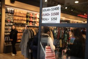 (250407) -- BUENOS AIRES, 7 abril, 2025 (Xinhua) -- Un cartel indica la cotización del dólar paralelo en un local comercial, en la ciudad de Buenos Aires, capital de Argentina, el 7 de abril de 2025. (Xinhua/Martín Zabala) (mz) (rtg) (ah) (ce)