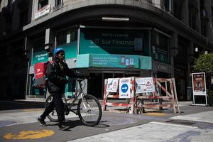 (250925) -- BUENOS AIRES, 25 septiembre, 2025 (Xinhua) -- Un trabajador de una aplicación de mensajería camina frente a un local de venta de divisas, en la ciudad de Buenos Aires, capital de Argentina, el 25 de septiembre de 2025. La directora gerente del Fondo Monetario Internacional, Kristalina Georgieva, aseguró el miércoles que la asistencia financiera para Argentina anunciada por el Gobierno de Estados Unidos y otros organismos multilaterales, como el Banco Mundial, fortalecerá el programa que el Fondo sostiene con el país suramericano. (Xinhua/Martín Zabala) (mz) (jg) (ah) (vf)