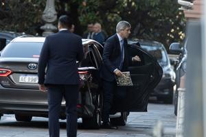 (250412) -- BUENOS AIRES, 12 abril, 2025 (Xinhua) -- Imagen del 11 de abril de 2025 del ministro de Economía argentino, Luis Caputo, llegando a la Casa Rosada, en la ciudad de Buenos Aires, capital de Argentina. Caputo anunció el viernes que a partir del próximo lunes se levantarán las restricciones cambiarias en el país, y el régimen cambiario pasará a un sistema de flotación de bandas entre los 1.000 y 1.400 pesos por dólar. (Xinhua/Martín Zabala) (mz) (jg) (da)