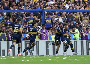 (251109) -- BUENOS AIRES, 9 noviembre, 2025 (Xinhua) -- El jugador Miguel Merentiel (d), de Boca Juniors, festeja su anotación junto a sus compañeros de equipo durante el partido correspondiente a la fecha 15 del Torneo Clausura 2025, ante River Plate, celebrado en el estadio Alberto J. Armando, en la ciudad de Buenos Aires, Argentina, el 9 de noviembre de 2025. (Xinhua/Martín Zabala) (mz) (rtg) (da)