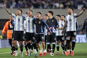 (250326) -- BUENOS AIRES, 26 marzo, 2025 (Xinhua) -- Imagen del 25 de marzo de 2025 de jugadores de Argentina festejando al término del partido de las Eliminatorias Sudamericanas para el Mundial de Estados Unidos, México y Canadá 2026, ante Brasil, celebrado en el Estadio Mâs Monumental, en la ciudad de Buenos Aires, capital de Argentina. (Xinhua/Martín Zabala) (ah) (ra) (vf)