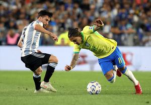 (250326) -- BUENOS AIRES, 26 marzo, 2025 (Xinhua) -- Imagen del 25 de marzo de 2025 de Nicolás Tagliafico (i), de Argentina, disputando el balón con Raphinha (d), de Brasil, durante el partido de las Eliminatorias Sudamericanas para el Mundial de Estados Unidos, México y Canadá 2026, celebrado en el Estadio Mâs Monumental, en la ciudad de Buenos Aires, capital de Argentina. (Xinhua/Martín Zabala) (ah) (ra) (vf)