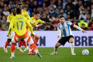 (250611) -- BUENOS AIRES, 11 junio, 2025 (Xinhua) -- Imagen del 10 de junio de 2025 del jugador, Lionel Messi (d), de Argentina, controlando el balón durante el partido ante Colombia correspondiente a las Eliminatorias Sudamericanas para el Mundial de Estados Unidos, México y Canadá 2026, celebrado en el Estadio Monumental, en la ciudad de Buenos Aires, capital de Argentina. (Xinhua/Meng Dingbo) (ra) (ce)