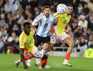 (250611) -- BUENOS AIRES, 11 junio, 2025 (Xinhua) -- Imagen del 10 de junio de 2025 del jugador, Lionel Messi (c), de Argentina, disputando el balón con Davinson Sánchez (i), y Daniel Muñoz (d), de Colombia, durante el partido correspondiente a las Eliminatorias Sudamericanas para el Mundial de Estados Unidos, México y Canadá 2026, celebrado en el Estadio Monumental, en la ciudad de Buenos Aires, capital de Argentina. (Xinhua/Martín Zabala) (ra) (ce)